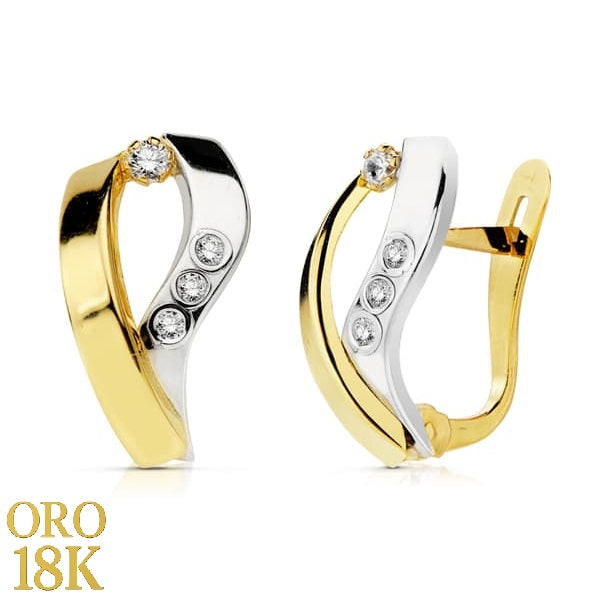 Pair of 18k gold earrings with Catalan closure, with bicolor bands and zircons, measuring 15x8mm