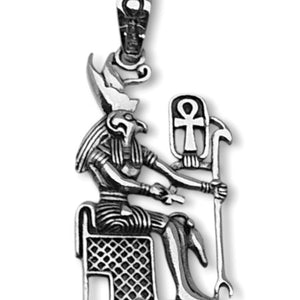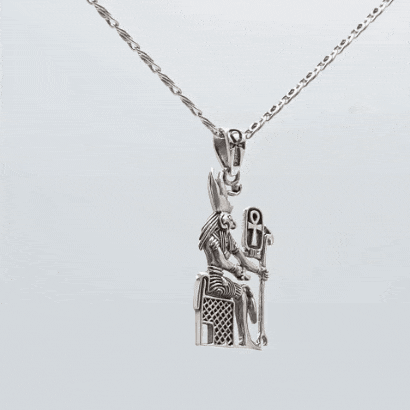 The amulet features a detailed figure of the god seated on a throne, with a staff in one hand and a cross of life in the other.