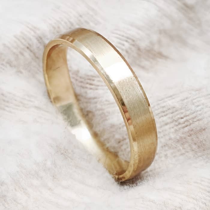 Alianza de oro 18k fabricada a mano de 4 mm de ancho matizada borde en brillo
