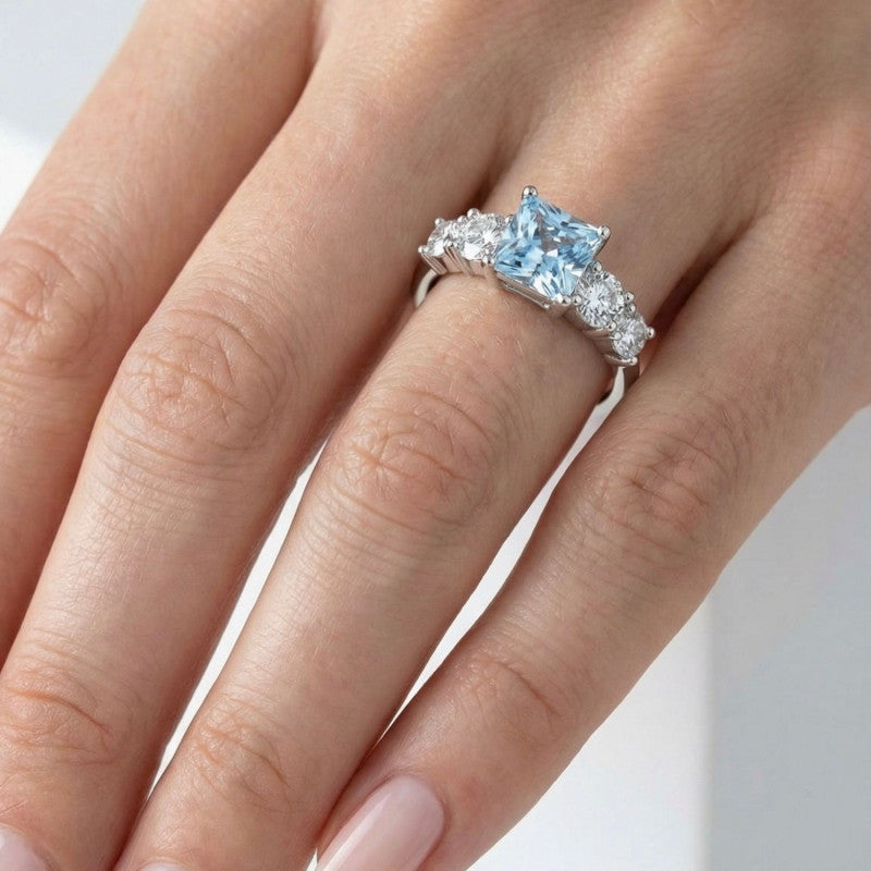 Anillo de Plata de Ley con aguamarina grande y dos circonitas a cada lado