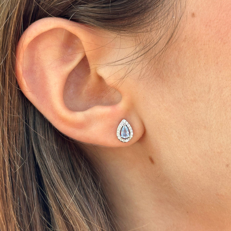 Pendientes y colgante de plata de ley en forma de gotas con circonitas blancas y azules