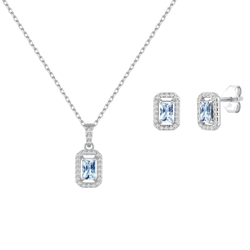 Pendientes y colgante de plata de ley con circonitas color aguamarina rectangular