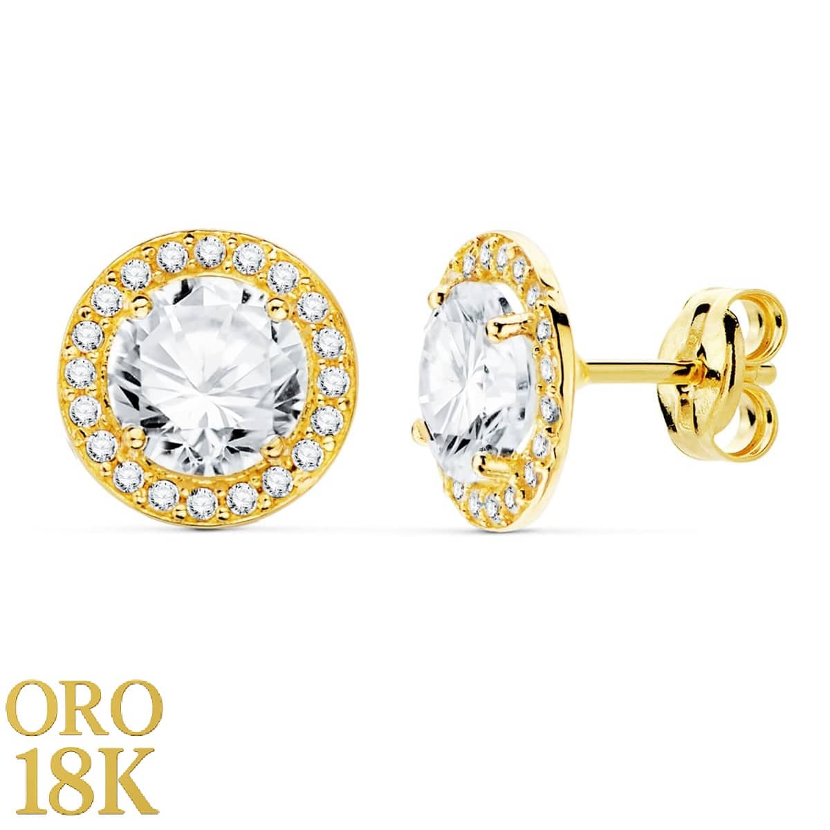 18K PENDIENTES ORO AMARILLO REDONDOS CIRCONITAS 9 MM CIERRE PRESION