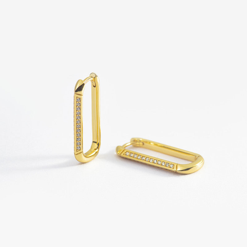 Pendientes de plata de ley 925 — también conocida como plata esterlina o plata italiana — en forma de aro rectangular con acabado de circonitas de alta calidad. Disponibles en dos acabados a elegir: plata y dorado.