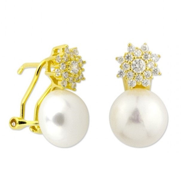 Pendientes de plata chapada en oro tú y yo con cierre omega con rosetón de circonitas