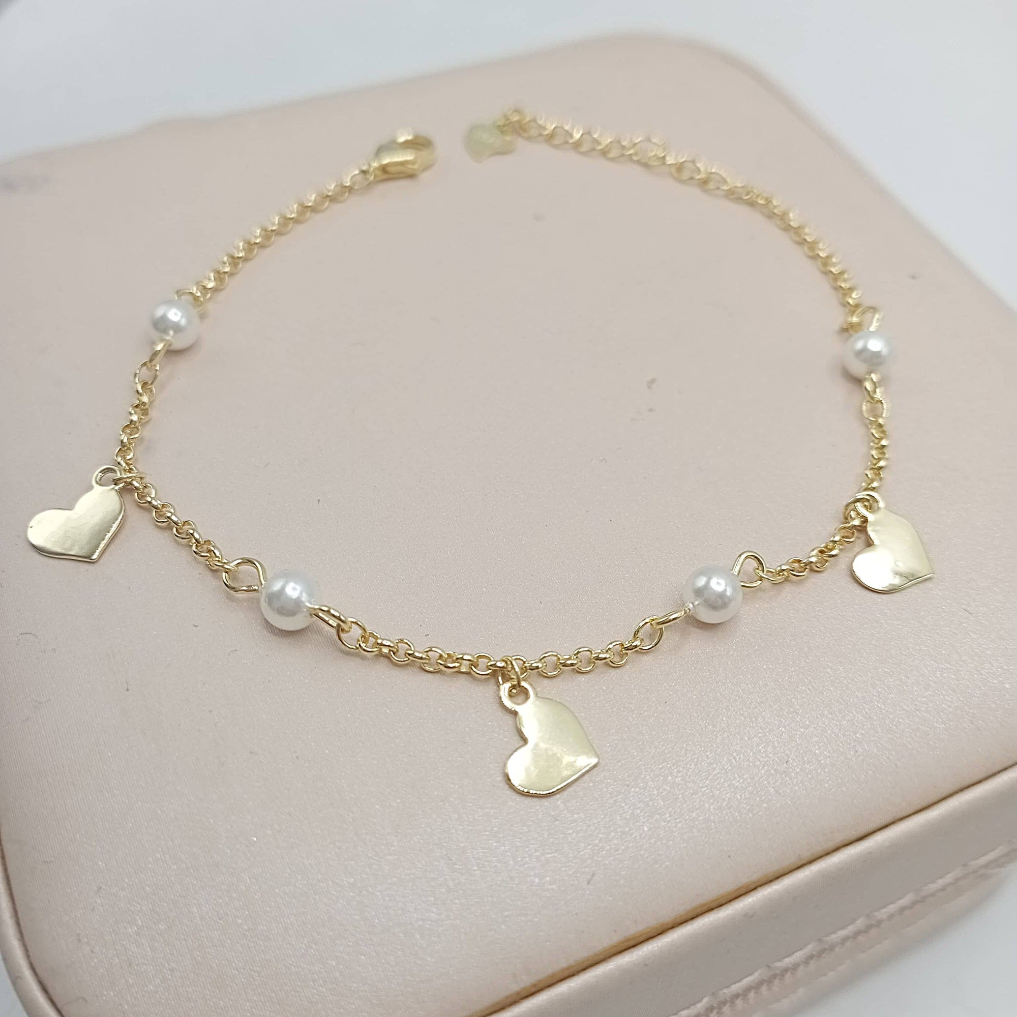 Pulsera de plata fina con colgantes en forma de corazón y perlitas chapada en oro
