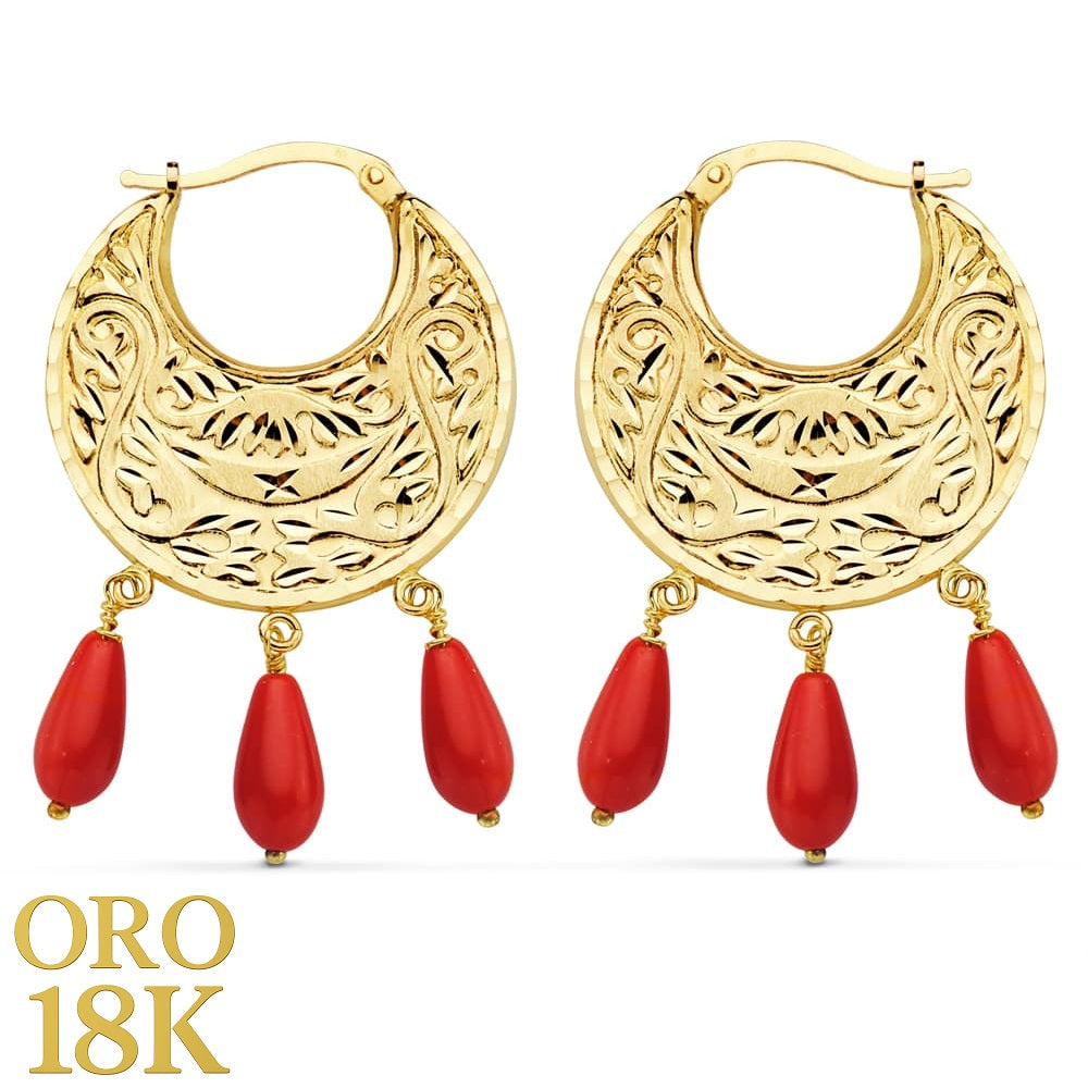 Par de argolas planas esculpidas em ouro com lágrimas de coral estampadas