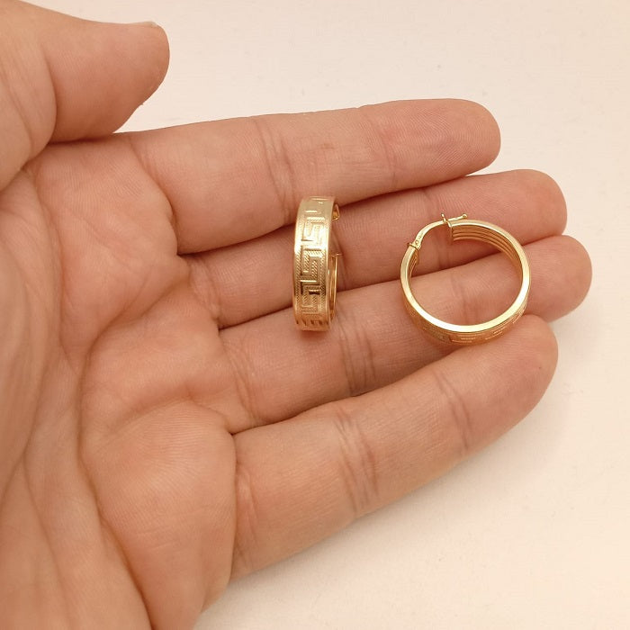 Par de aros de oro de ley 18k con dibujo de greca 6mm de anchos tamaño grande
