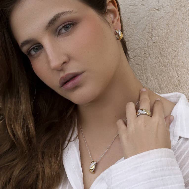Pendientes de plata de ley bicolor con cierre omega y circonitas