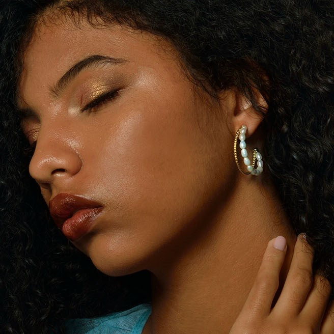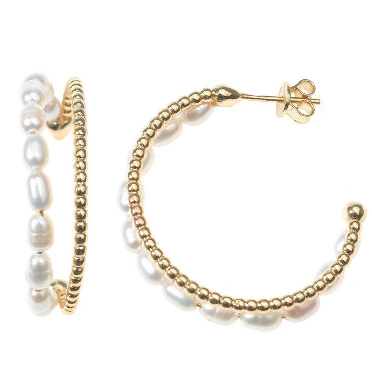 Pendientes de plata de ley bañada oro largos con perlas, tipo aro